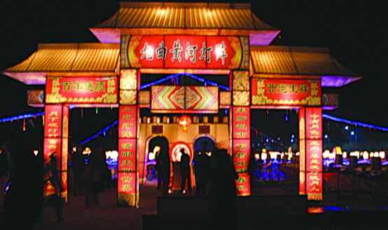 高臺(tái)黃河燈陣全稱為“九宮八卦黃河陣”,又叫“九曲黃河陣”或“燈桿會(huì)”。自明清以來(lái),高臺(tái)縣較大的堡子每年正月十三到正月十六都有黃河燈陣,主要是為了當(dāng)?shù)匕傩涨蠹榍笃桨玻耐忻篮米T浮恼率蝗站烷_(kāi)始著手準(zhǔn)備,并且這一天在燈場(chǎng)中心立一根高8米的木柱,稱之為“立大桅”。在“大桅”的頂端高掛“混元金斗”燈,掛一塊6.4米長(zhǎng)的黃布,稱“杏黃大旗”,在大桅下面設(shè)置中央祭臺(tái),擺放趙公明(財(cái)神爺)畫(huà)像或塑像,放置香爐、香表之類,擺一功德箱,設(shè)一中堂,有燈官坐堂,兩班衙役(當(dāng)?shù)厝罕姲缪?跟隨,人們?cè)诖似砬笮腋0部怠⑽骞蓉S登。在祈福時(shí),要跪拜燈官老爺,燈官老爺口念祝頌語(yǔ),賜福于跪拜者;然后由兩班衙役手持水火棍在跪拜者身上輕輕擊打,同齡熟人之間故意打得較重,以逗笑取樂(lè),同時(shí)口念“一打國(guó)泰民安,二打風(fēng)調(diào)雨順,三打長(zhǎng)命百歲,四打大吉大利”等祝福語(yǔ)。正月十三晚上,在大桅四周按21行、21列呈正方形栽植木桿,并拔去中央9個(gè),以留出中央祭臺(tái)的位置,木桿高1.2米,共432根,行距、株距視場(chǎng)地大小而定,用繩子將這些木桿連接起來(lái),繩上粘貼彩紙小旗,形成一個(gè)迷宮般的燈陣。每個(gè)木桿頂端放一塊20厘米見(jiàn)方的小木板,小木板四周糊上15厘米寬的一圈彩紙,再貼上各種窗花圖案,叫作燈帽子。在燈帽子中心放一盞由面粉捏成的小油燈,添上清油,放上捻子。一般燈桿、燈帽、面燈都是本村老百姓自發(fā)捐來(lái)的,面燈都是蒸熟的。關(guān)于點(diǎn)花燈,還有一些傳統(tǒng),即“正月十三是白燈,正月十四半場(chǎng)子燈,十五、十六是全燈”。具體做法是:正月十三晚上,只點(diǎn)燃中間大桅上的主燈和四角木柱上的幾盞燈;正月十四晚上,點(diǎn)燃中央主燈和八個(gè)方位上的一部分燈;正月十五、十六晚上點(diǎn)燃所有的燈。四角四燈柱高掛燈串,四周全用紅燈圍起,不得隨意入內(nèi),每陣中央設(shè)置黃色燈籠提示游人慢行。目前,高臺(tái)黃河燈陣主要在黑泉鄉(xiāng)鎮(zhèn)江村沿襲傳承。此外,合黎鄉(xiāng)五三村也有“卍”字燈陣,布陣方法有所不同,在四角及中央的木柱上分別書(shū)寫(xiě)“東方甲乙木星之神位、南方丙丁火星之神位、中央戊己土星之神位、西方庚辛金星之神位、北方壬癸水星之神位”。在該縣黑泉鄉(xiāng)定平村(原稱大寧堡)堡內(nèi)西北角原有一“燈架灣”,中立大桅常年不撤,因而得名。 2011年3月16日,高臺(tái)黃河燈陣被甘肅省人民政府列入第三批甘肅省非物質(zhì)文化遺產(chǎn)代表性項(xiàng)目名錄。保護(hù)單位:張掖市高臺(tái)縣文化館。