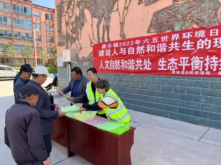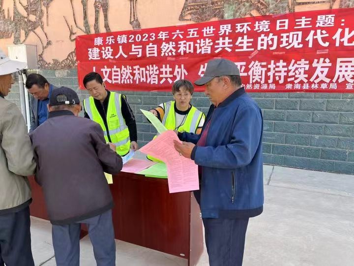 中國張掖網肅南訊 6月5日是世界環境日,在第52個世界環境日即將到來之際,為進一步增強人民群眾的環境保護意識,肅南縣自然資源局康樂自然資源所工作人員在康樂鎮小廣場開展“建設人與自然和諧共生的現代化”主題宣傳。